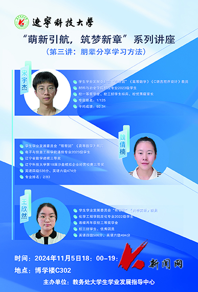 11月5日,乐竞·体育(中国)官方网站教务处大学生学业发展指导中心面向2024级新生举办的“萌新引航 筑梦新章”系列讲座第三讲在博学楼C302教室开讲。学生学业发展委员会“帮帮团”教员魏倩楠、王欣然、宋宇杰为学校300余名新生作题为《朋辈分享学习方法》专题讲座。