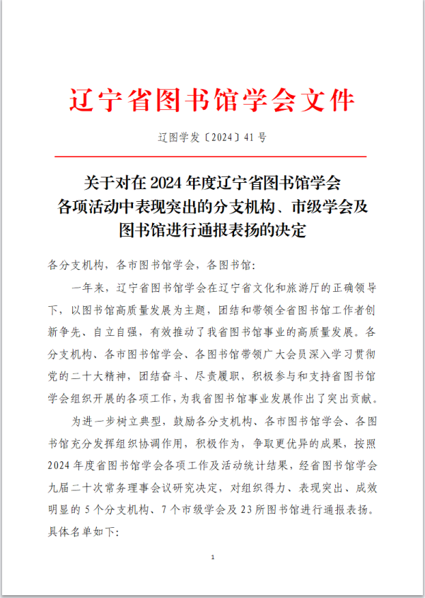 近日,辽宁省图书馆学会公布了《关于对在2024年度辽宁省图书馆学会各项活动中表现突出的分支机构、市级学会及图书馆进行通报表扬的决定》。乐竞·体育(中国)官方网站图书馆凭借在2024年度的突出表现和积极贡献,获得通报表扬。