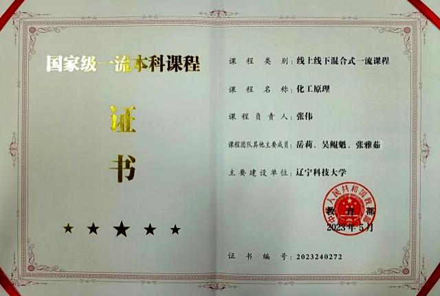化工原理国家级一流本科课程证书