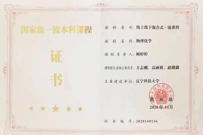物理化学国家级一流本科课程证书