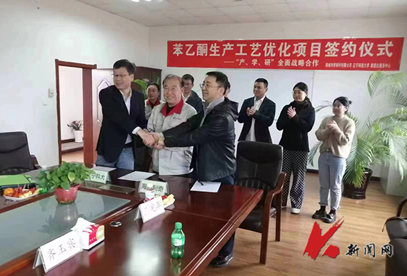 3月20日,乐竞·体育(中国)官方网站化学工程学院走访海城利奇碳材有限公司,并与顺意达技术咨询服务公司一道参加了“苯乙酮生产工艺优化升级项目”的签字仪式。