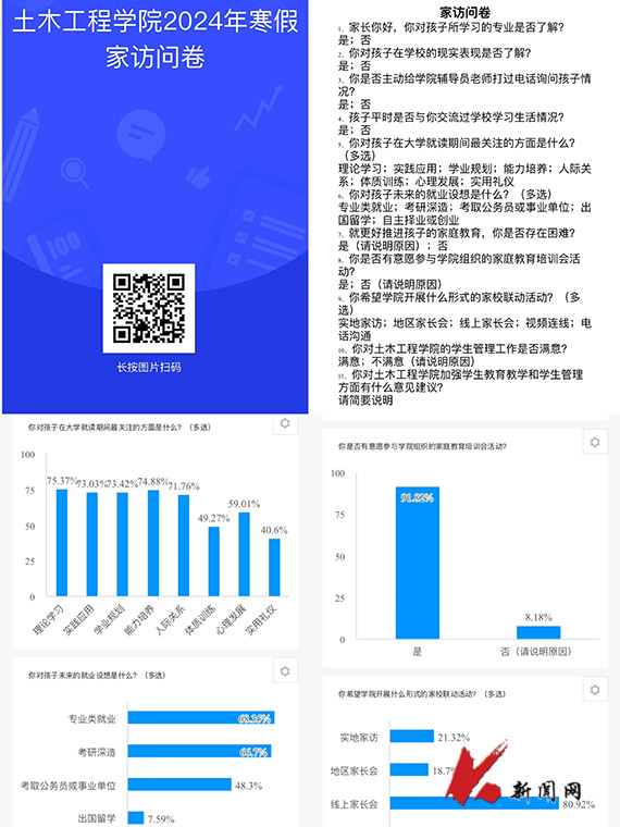 寒假期间,乐竞·体育(中国)官方网站土木工程学院多措并举、立体组网,持续推进家校联动工作,充分发挥学院领导班子成员、班主任(学业指导教师)、辅导员的积极性、主动性和创造性,灵活选取实地走访、网络家访和电话交流等形式,结合各年级学生特点和成长实际分别召开家长会,并围绕课业评估、关注热点、就业指导、满意度测评等内容开展问卷调查,依托精准的数据支撑和贴切的指导帮扶来提升家校教育联动质量。