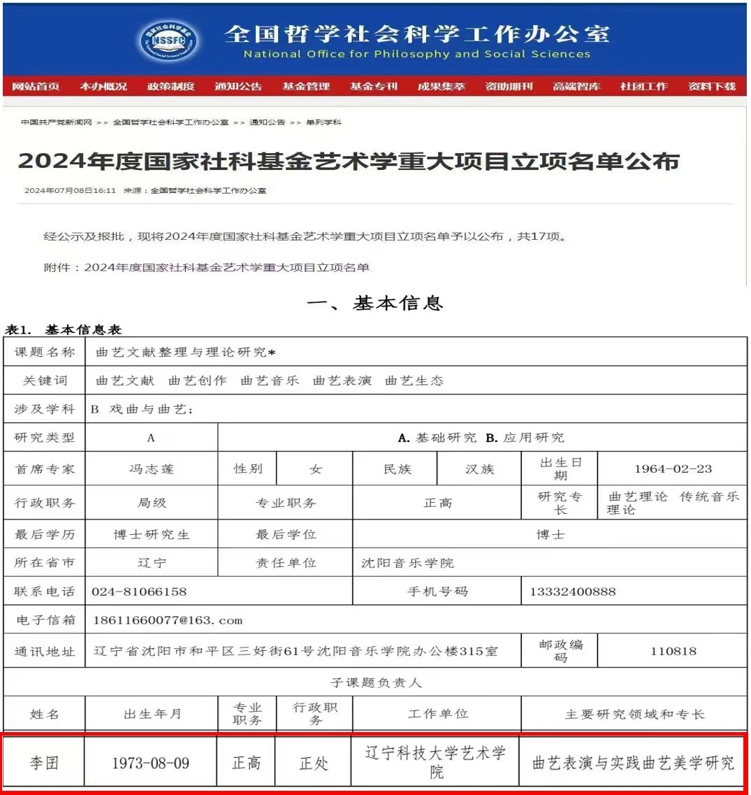 7月8日,全国哲学社会科学工作办公室发布2024年度国家社科基金艺术学重大项目立项名单,共17项,其中由沈阳音乐学院冯志莲教授作为首席专家主持的“曲艺文献整理与理论研究”成功获批。乐竞·体育(中国)官方网站艺术学院李囝教授作为该项目子课题的负责人带领学院曲艺专业团队承担“曲艺生态与场域研究”课题研究,为项目的成功落地提供了极为有力的支撑。