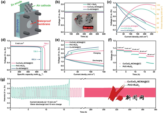 可充电锌-空气电池具有能量密度高、安全性好、环境友好等优点,被认为是一种很有前途的储能装置。然而,非贵金属催化剂在改善锌-空气阴极缓慢的氧反应动力学方面仍面临挑战。为了解决这一问题,该研究以金属-有机框架(MOF)为前驱体,采用碳化-水解过程,构建了CeO 2/Co异质结构修饰的氮掺杂多孔碳纳米片阵列垂直生长在碳布上的集成阴极。该材料独特的优势在于,首先,垂直生长在碳布上的氮掺杂多孔碳纳米片阵列电极不仅可以在不使用任何导电剂、粘合剂的情况下,直接在集流体与催化剂之间进行快速的电子转移和质量传递,而且纳米片阵列结构改善了原始碳布浸润性,避免了制备过程中的团聚现象,进而使活性位点更容易介入,增强了活性位点利用率。其次,构建CeO 2/Co异质结构从而利用CeO 2丰富氧空位调控催化位活性氧,有效提高Co物种活性位点催化效率,并且二者协同催化促进了氧反应(氧还原和氧析出)进行。该集成材料用于锌-空气电池阴极展现了优异催化性能,表现出高开路电压、比容量和倍率性能,并且在高电流密度下,具有极好的充放电稳定性。