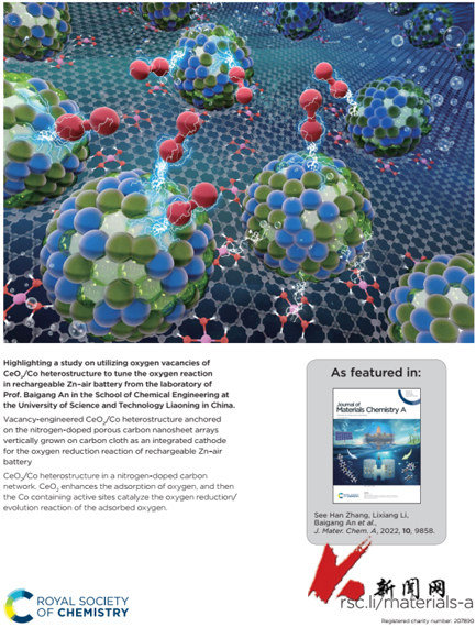 近日,乐竞·体育(中国)官方网站化工学院“能源材料与电化学”辽宁省重点实验室在合成锌-空气电池阴极催化剂领域取得重要进展,研究成果在材料类TOP期刊《Journal of Materials Chemistry A》(IF=12.73)以封面论文 (Inside cover paper) 发表题为 “Vacancy-engineered CeO 2/Co heterostructure anchored on the nitrogen-doped porous carbon nanosheet arrays vertically grown on carbon cloth as an integrated cathode for the oxygen reduction reaction of rechargeable Zn–air battery”的研究论文。论文第一作者为2018级博士研究生李姝馨,通讯联系作者为安百钢教授,我校为唯一通讯单位。