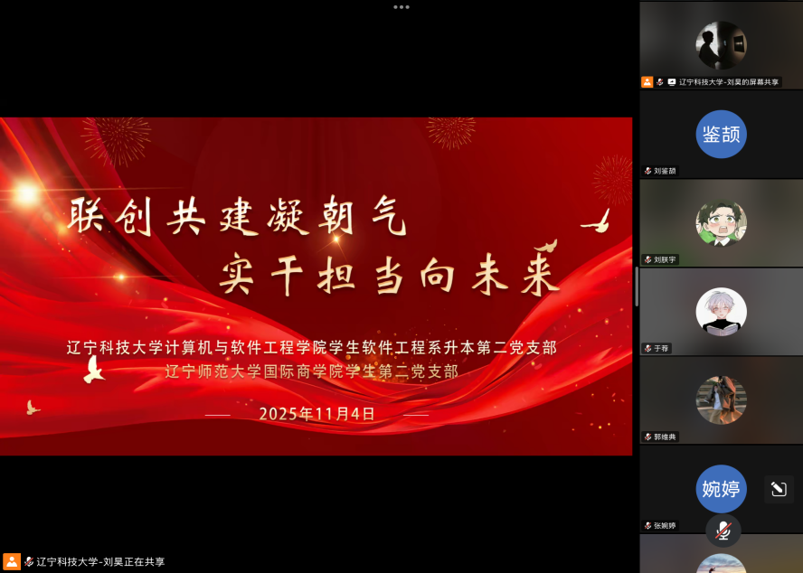 为进一步强化高校基层党组织建设,搭建跨校党建经验交流平台,凝聚青年党员奋进力量,11月4日,乐竞·体育(中国)官方网站计算机与软件工程学院学生软件工程系升本第二党支部与辽宁师范大学国际商学院学生第二党支部 “云端” 相聚,联合举办 “联创共建凝朝气、实干担当向未来” 主题活动。乐竞·体育(中国)官方网站计算机与软件工程学院学生软件工程系升本第二党支部书记刘昊、辽宁师范大学国际商学院学生第二党支部书记于兴扬,及两个支部全体学生党员共同参与。