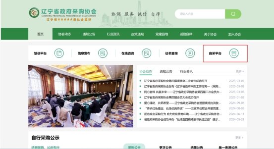 浏览器搜索辽宁省政府采购协会(或浏览器直接输入网址:http://www.lngpa.cn/#/)并打开LEJING SPORTS,点击右上角【自采平台】,进入登录页。